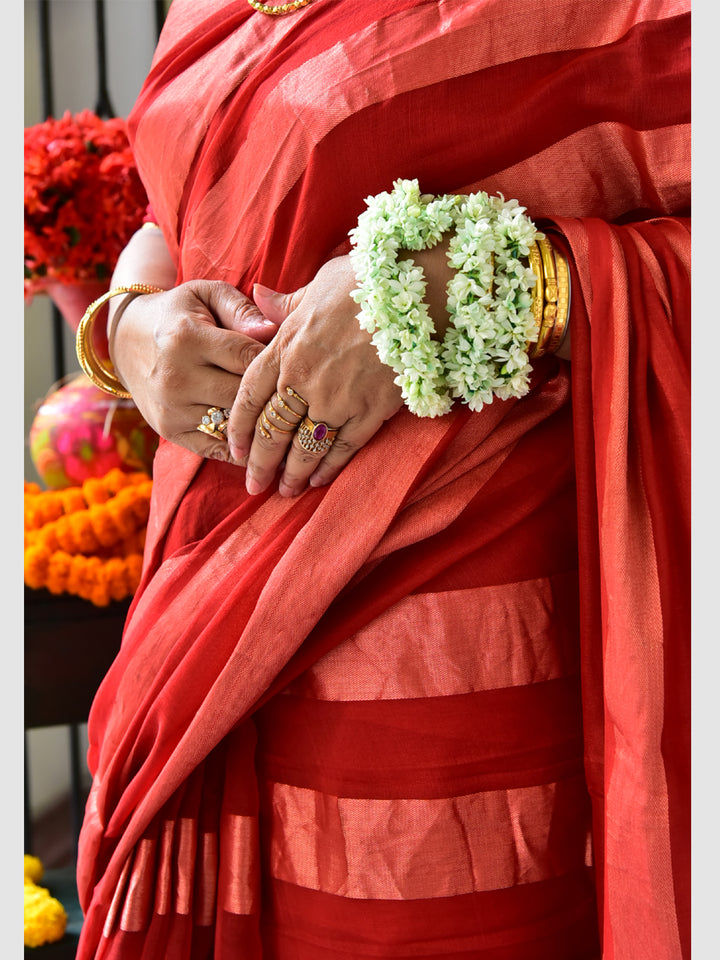 | Traditional Indian dyes in red, dark pink and indigo tend to rub. Avoid contact with white garments and accessories before a few washes settle the colour. |